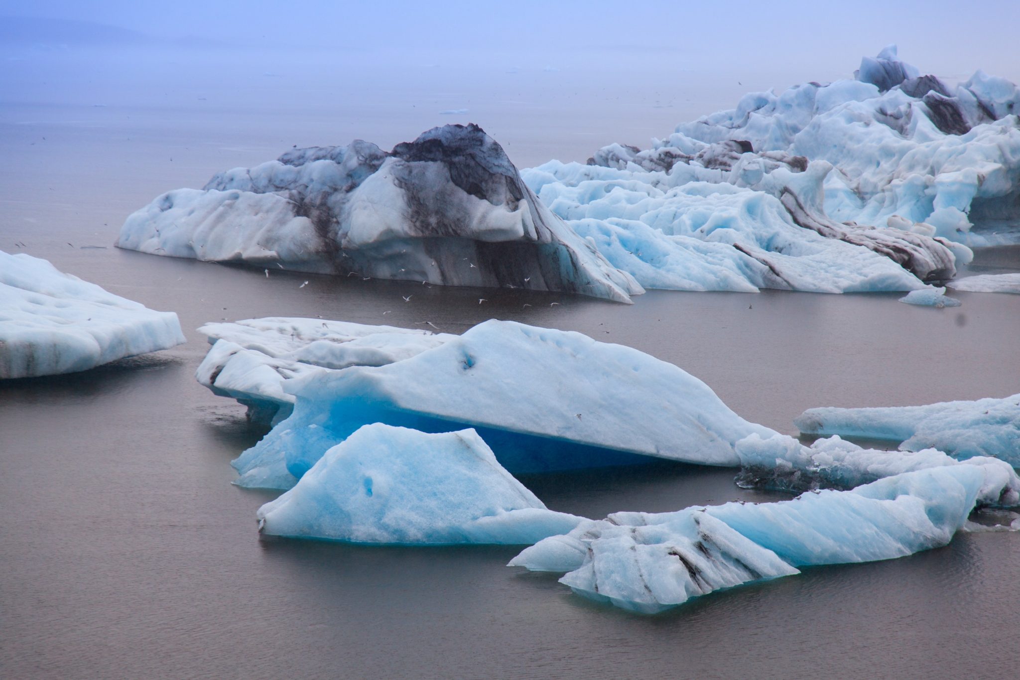 Wieczorem docieramy do Lodowej Laguny powstałej z topiącego się lodowca Vatnajökull. Właściwie dojeżdżając do tego miejsca nie mieliśmy pojęcia czego się spodziewać. Wyjeżdżając z za zakrętu pojawia się przed nami most. Coś przykuwa naszą uwagę. To potężne bloki lodu pływające po jeziorze. Na zewnątrz pada deszcz, nad nami prawie czarne niebo, z niezliczoną ilością warstw chmur, lecz po lewej stronie jasno-niebieskie bloki lodowca wyglądają jak ogromne abstrakcyjne turkusy. Widok jest tak niesamowity, że prawie wbija nas w ziemie.