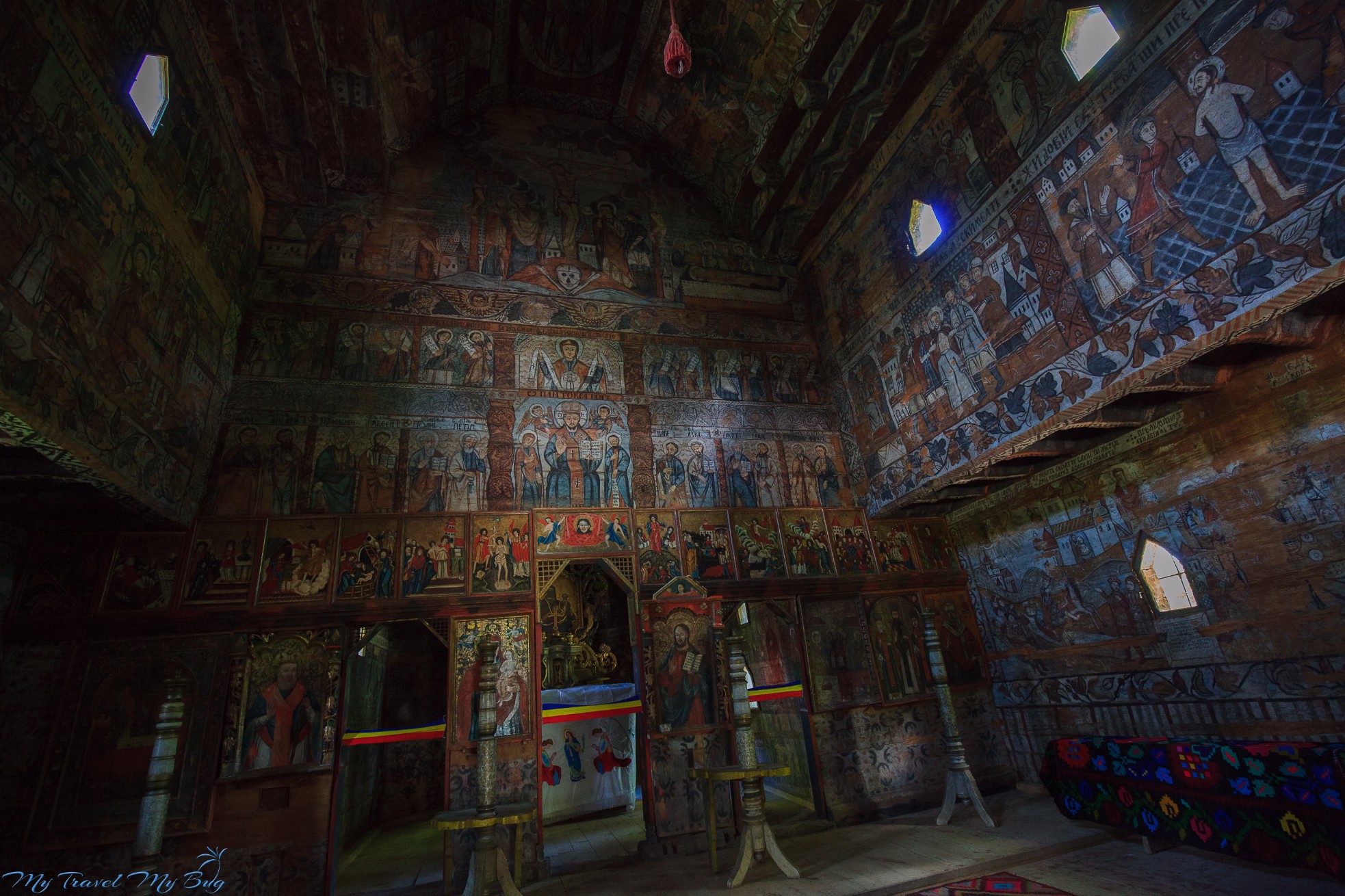 Do środka prowadzą małe drewniane drzwi, schylamy głowy i przenosimy się do innej epoki. W środku panuje półmrok, charakterystyczny zapach starego drewna. Na ścianach dostrzegamy malowidła. Większość nawiązuje tematyką do Nowego i Starego Testamentu, znajdziemy jednak również elementy z czasów podbojów imperium Osmańskiego. Polichromie pochodzą z lat 1778-1783 i pokrywają każdą wolną przestrzeń cerkwi. Przysiadamy na chwilę o rozglądamy się w okół. Przez wąskie okna sączy się światło sprawiając nierealne wrażenie.